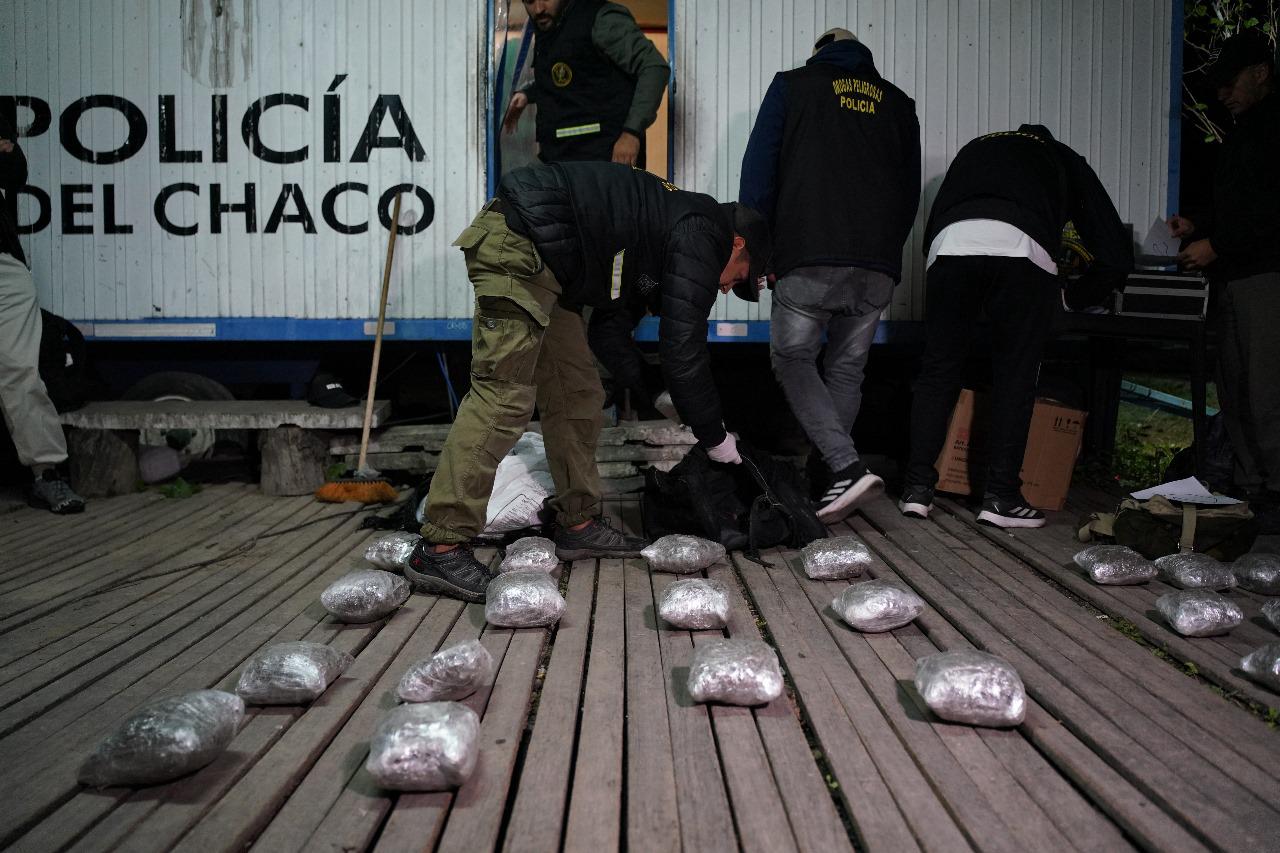 Poco después, los efectivos interceptaron la motocicleta 150 cilindradas en inmediaciones del paraje Costa Inés, mientras que la segunda fue detenida en el acceso a Margarita Belén. Tras identificar a los involucrados, y con testigos presentes, los efectivos regresaron al punto donde se había producido la parada previa, hallando entre la vegetación de la banquina dos bolsos y una bolsa tipo consorcio que contenían un total de 42 paquetes termo sellados con marihuana, con un peso total de 22,088 kilogramos.
