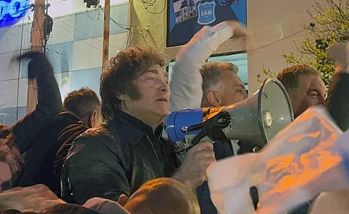 El máximo exponente de La Libertad Avanza descendió acompañado de Santilli y del intendente Guillermo Montenegro, recorrió unos metros en medio de la multitud sin llegar a la esquina donde se anunciaba su desembarco y luego se replegó: se subió a la caja de la camioneta que lo trasladó y le habló a los militantes que lo esperaban con un megáfono.