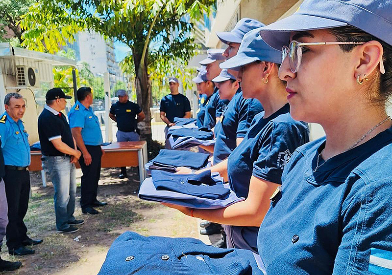 En el marco de las políticas impulsadas por el gobernador Leandro Zdero para mejorar las condiciones laborales de la Policía del Chaco en toda la provincia, el ministro de Seguridad, Hugo Matkovich, junto al jefe y sub jefe de la Policía, Crio. Gral. Fernando Romero y Crio. Gral. Manuel Silva, respectivamente, y el Director Ejecutivo del CEAC, Crio. Gral. Cristian Durán, entregaron 75 nuevos uniformes confeccionados en su totalidad por el Departamento Logística Sastrería de la Policía Provincial, al personal de seguridad afectado al edificio de la Casa de Gobierno y sus alrededores.