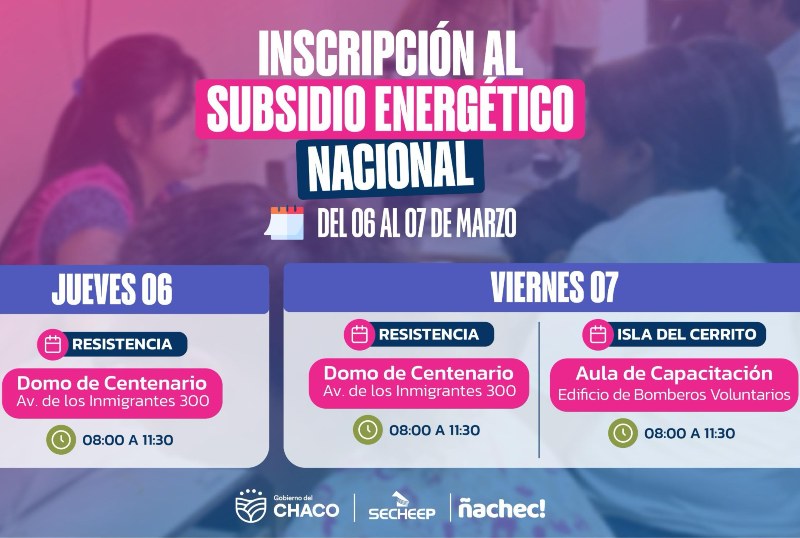 El Ministerio de Desarrollo Humano, a través del Programa Ñachec, y con la colaboración de Ecom Chaco, llevará a cabo un operativo de inscripción para el subsidio eléctrico nacional.