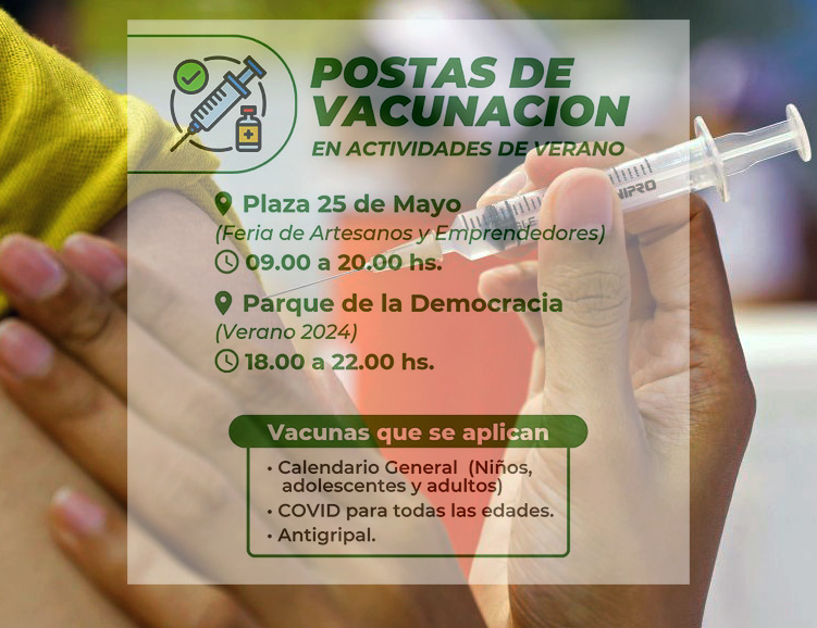 La Municipalidad de Resistencia y el Ministerio de Salud de la Provincia, comenzarán el fin de semana operativos de vacunación en las actividades conjuntas que se realizan en la Plaza 25 de Mayo y Parque de la Democracia. Comprende las del calendario general, las de Covid para todas las edades y la antigripal.