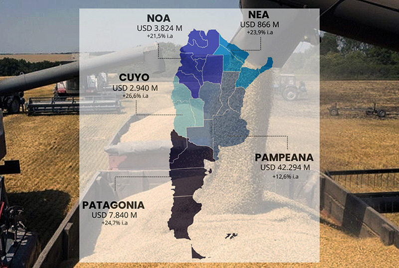 Según el informe de la Consultora Politikon, allí se advierte que la región Pampeana concentró el 71,5% del total exportado, por un monto de USD 42.294 millones; le sigue la Patagonia con el 13,3% (por USD 7.840 millones), el NOA con el 6,5% (USD 3,824 millones), Cuyo con el 5,0% (USD 2.940 millones) y cierra el NEA con el 1,5% (USD 886 millones). A su vez, el conjunto de otros con origen indefinido concentró el 2,3% del total (por USD 1.341 millones).