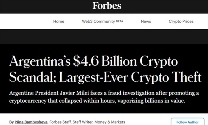 La noticia rápidamente generó un revuelo a nivel nacional y mundial. Y este lunes la revista Forbes calificó el escándalo como “el robo de criptomonedas más grande de la historia”. “Las cifras pintan un panorama brutal: el 86% de los comerciantes que compraron LIBRA perdieron dinero, con pérdidas totales que alcanzaron los 251 millones de dólares”, aseguró la publicación.