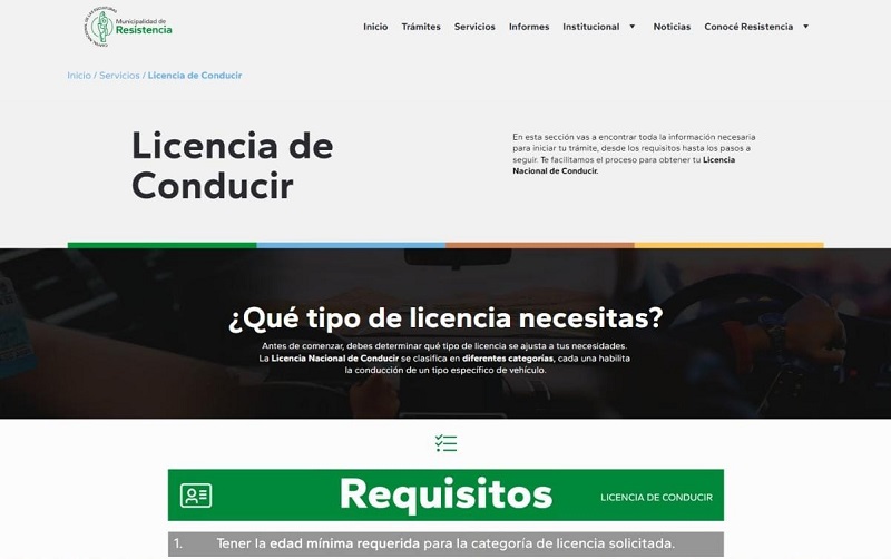 sitio web resistencia.gob.ar, con información acerca del trámite para el registro de conducir. En la página, además, figuran los servicios y gestiones que se pueden realizar en cada oficina municipal.