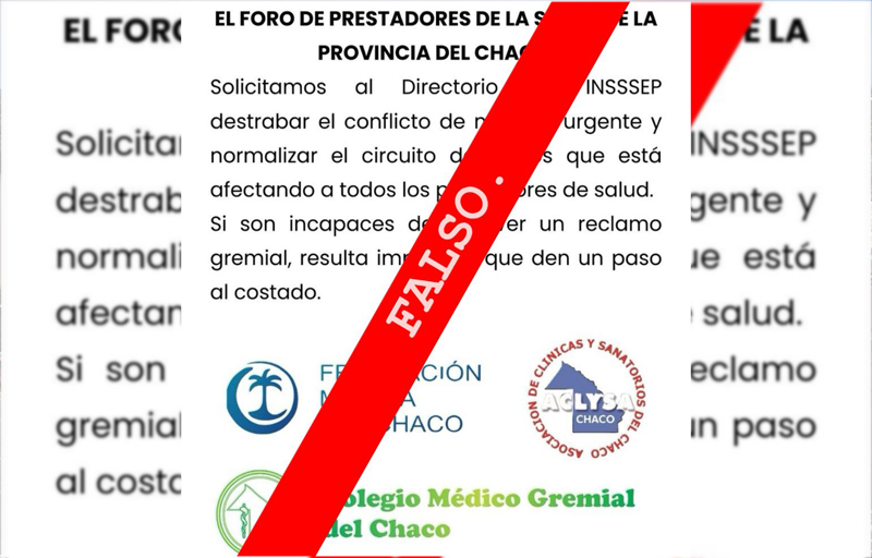 En el marco de la delicada situación generada en la Obra Social provincial y el Foro de Prestadores por la falta de pago debido al paro gremial que afecta al InSSSeP, este último desmintió la lamentable noticia falsa que comenzó a circular en redes sociales tras el comunicado dado a conocer en la mañana de este jueves.