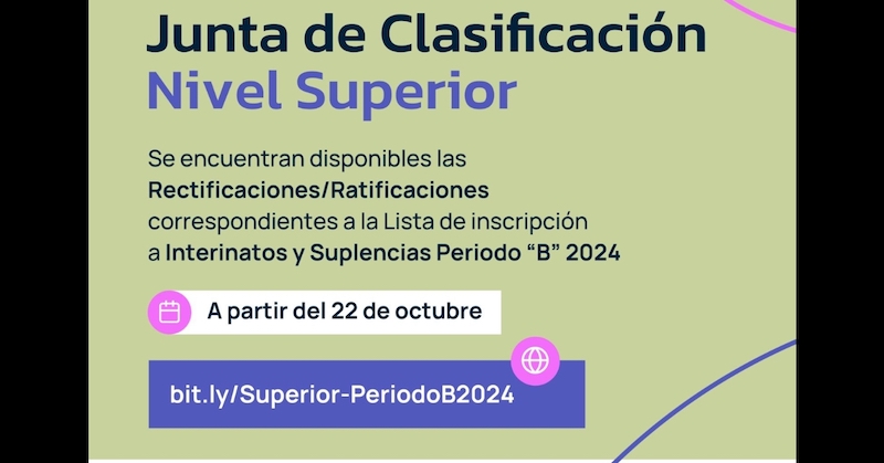 El Ministerio de Educación, a través de la Junta de Clasificación de Nivel Superior, comunica a los docentes interesados que a partir del 22 de octubre se encuentran disponibles las Rectificaciones/Ratificaciones correspondientes a la Lista de inscripción a Interinatos y Suplencias Período “B” 2024.