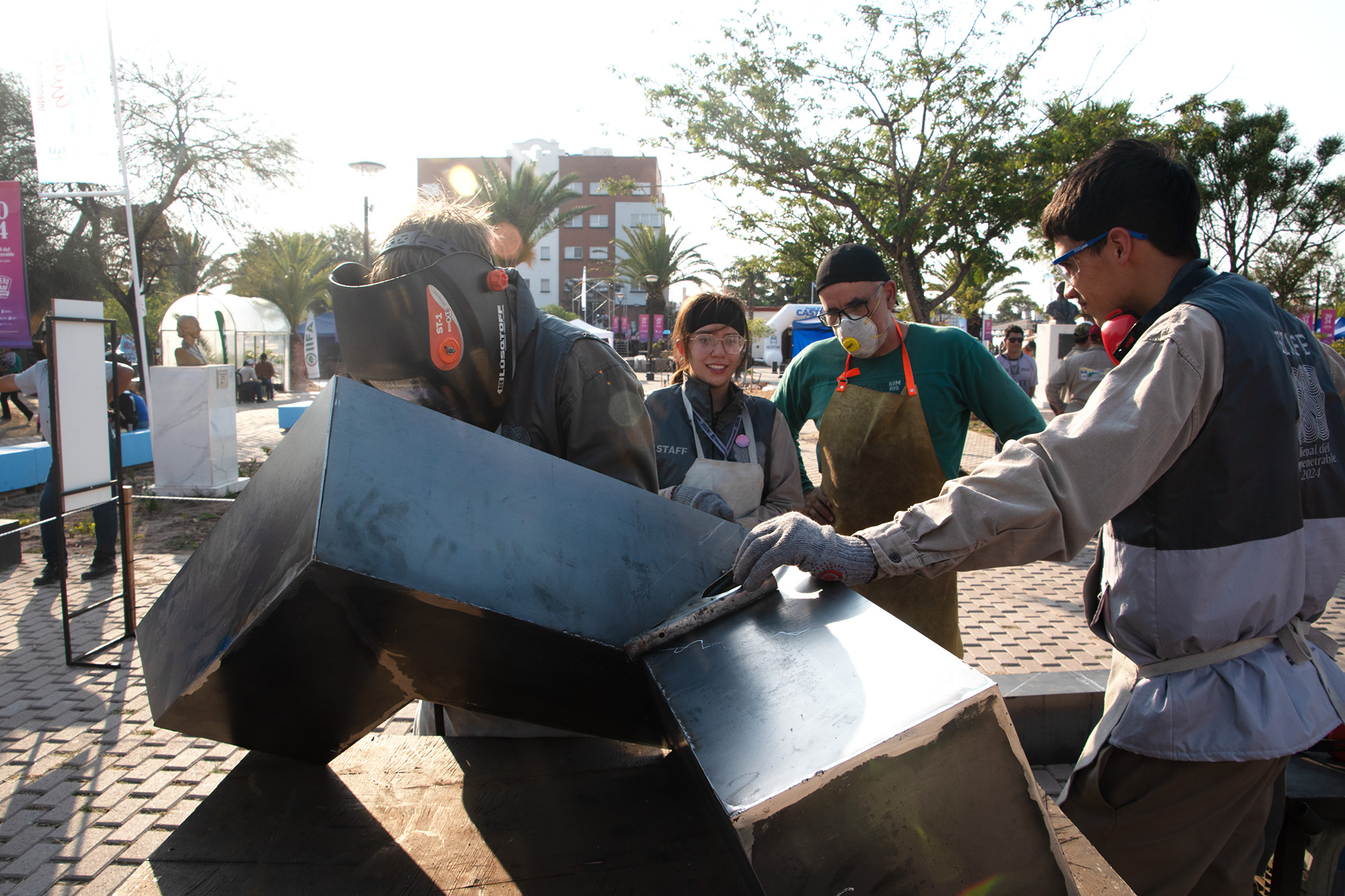 Desde Unquillo, Córdoba, llega el escultor correntino con una misión impostergable. Luis Bernardi nos ofrenda su obra titulada "La delgada línea roja", un nombre que evoca tanto precisión como pasión. "Vengo de Unquillo, donde estoy radicado", comenta mientras prepara su pequeño rodillo ya con signos de haber sido usado con pintura roja.