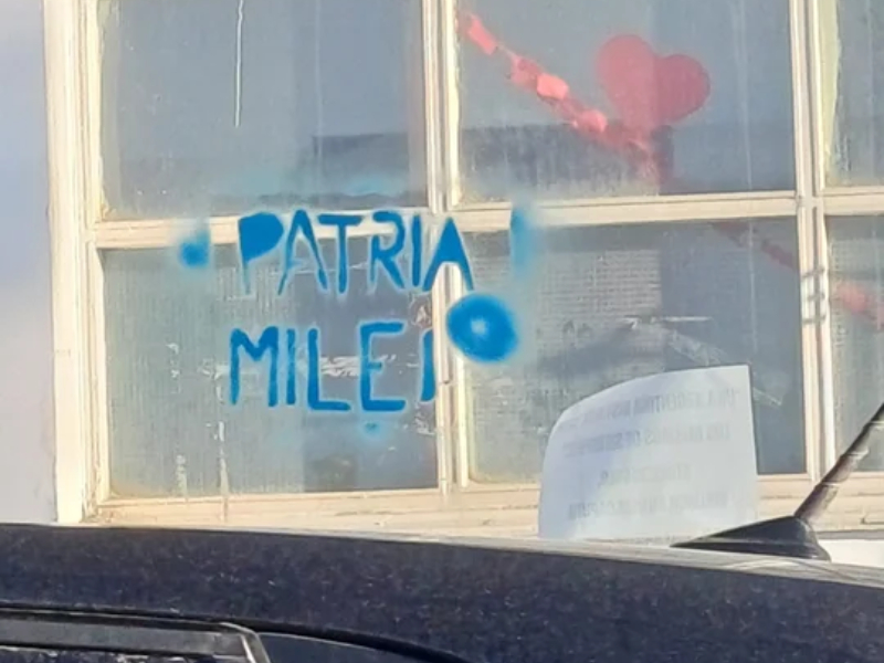 Por otra parte, las pintadas también hicieron referencia a las supuestas coimas que habría recibido la secretaria de Presidencia y hermana del presidente, Karina Milei, desde la Agencia Nacional de Discapacidad (ANDIS): “Alta coimera – 3%”, se lee en las paredes.
