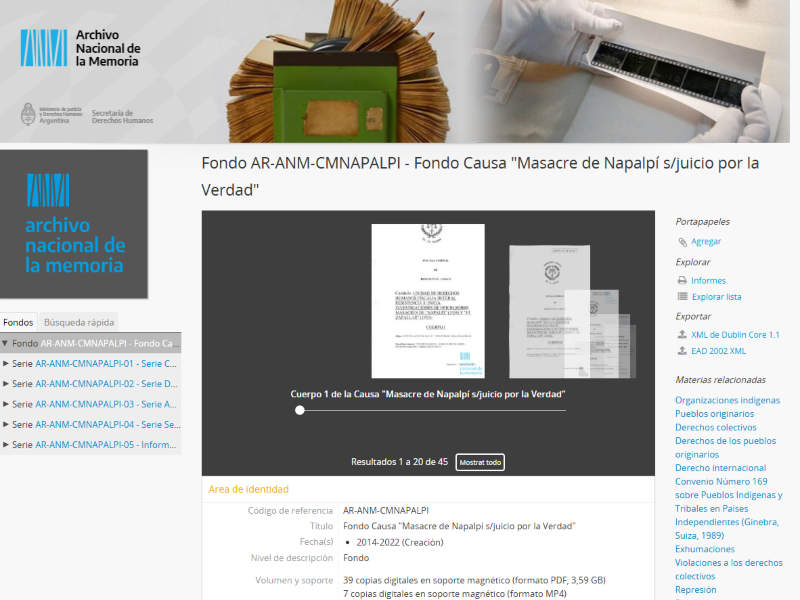 El Archivo Nacional de la Memoria (ANM) realizó el tratamiento archivístico del acervo documental de la Causa “Masacre de Napalpí S/Juicio por la Verdad” en cumplimiento de la sentencia del juzgado federal de resistencia del año 2022, como parte de las medidas de reparación para las víctimas, sus familiares y la sociedad toda. El reservorio es parte de las medidas de reparación ordenadas en la sentencia y es de acceso público y libre.