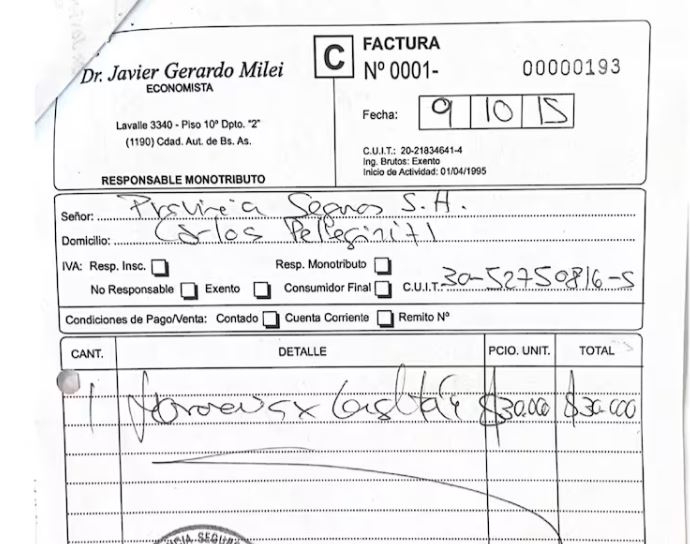 Las facturas señaladas son al menos 25, que Milei emitió de manera casi correlativa y en formato papel –no electrónicas– a favor de Provincia Seguros. Van de la factura 0164 en enero de 2014 a la factura 194 en octubre de 2015, mes en que se celebró la primera vuelta electoral de aquel año por la Presidencia. Las emitió para cobrar servicios de “consultoría”, “gastos”, “estudios complementarios” y “otros honorarios por trabajos pedidos”, según consta en las copias de esas facturas que obtuvo LA NACION.