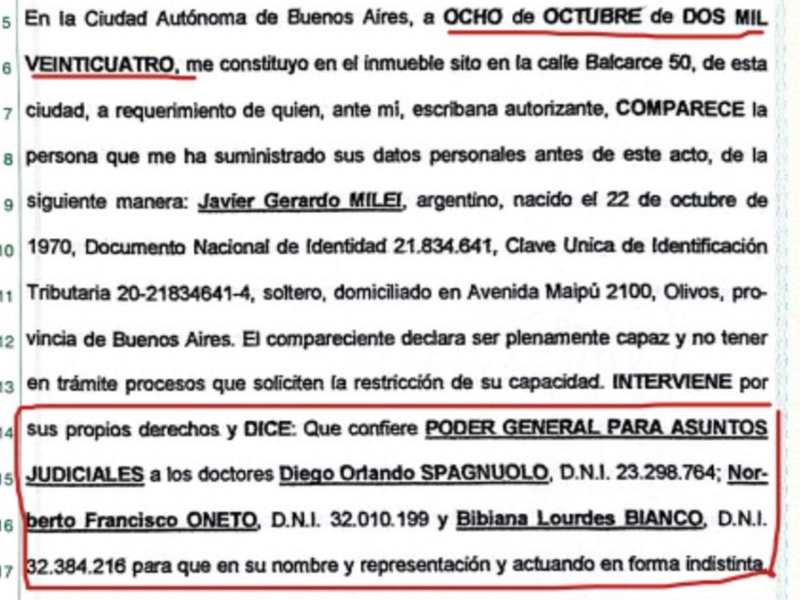 El domingo, Tiempo reveló la existencia de ese documento legal que fue firmado en octubre del año pasado en la Casa Rosada, con la certificación de la escribana pública Wanda Liberztein. «El compareciente (Milei) declara ser plenamente capaz y no tener en trámite procesos que soliciten la restricción de su capacidad. Interviene por sus propios derechos y DICE (sic): que confiere PODER GENERAL PARA ASUNTOS JUDICIALES a los doctores Diego Orlando Spagnuolo, Norberto Francisco Oneto y Bibiana Lourdes Bianco», dice el poder.