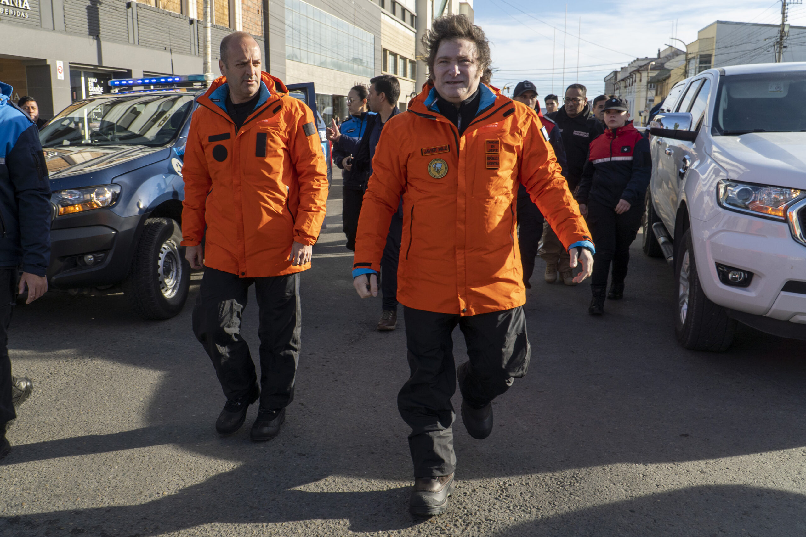 El Presidente Javiel Milei inicia su viaja hacia la Antártida, al salir del hotel saludo a la gente que lo esperaba fuera del hotel en Río Gallegos. 6 de enero de 2024.