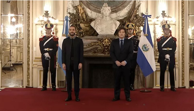 “Tengo la mejor impresión del mundo sobre Milei, me encanta lo que hace, somos amigos y vamos a lograr buenas cosas para ambos países”, le dijo Bukele, en sus primeras palabras oficiales en tierra argentina a un grupo de periodistas luego del acto que protagonizó con la canciller Diana Mondino, tras depositar una ofrenda floral en el Monumento a San Martín en el barrio de Retiro a unos pocos metros de la sede de la Cancillería argentina.