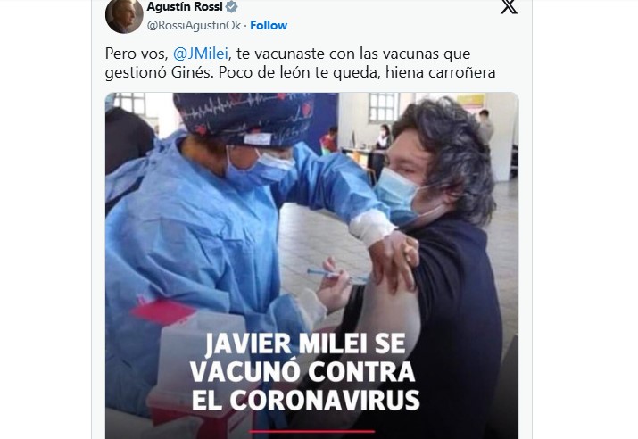 “Pero vos, @JMilei, te vacunaste con las vacunas que gestionó Ginés. Poco de león te queda, hiena carroñera”, lanzó el ex candidato a vicepresidente de Sergio Massa en 2023.