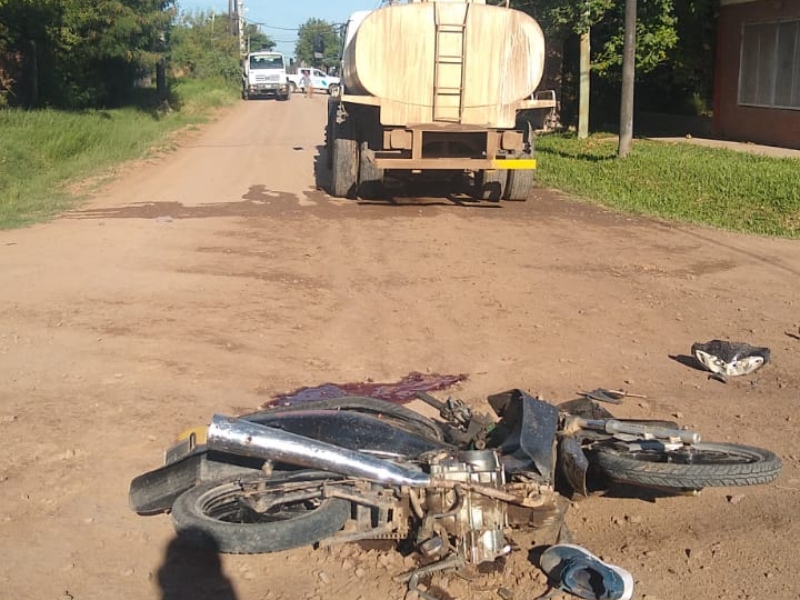 El siniestro ocurrió alrededor de las 8.20 en calle Donovan y Monseñor de la Localidad de San Martin, cuando una motocicleta marca Zanella ZB 110cc, guiada por un joven de 20 años, colisionó con un camión cisterna marca Volkswagen que pertenece al municipio local y era conducido por un ciudadano de 44 años.
