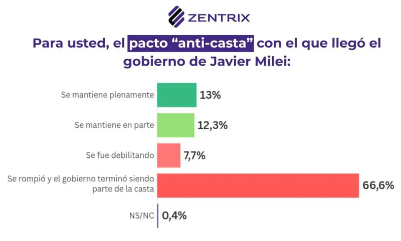 En concreto, según el relevamiento, el 66,6% de los consultados considera que el “pacto ‘anticasta'” de Milei “se rompió y el gobierno terminó siendo parte de la casta”, una cifra ampliamente mayoritaria que muestra desgaste en uno de los ejes identitarios del oficialismo.