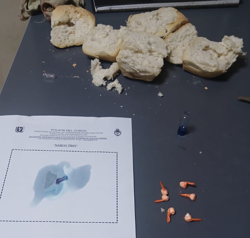 La requisa fue realizada por personal de guardia, quien constató que en el interior de panes tipo galleta había seis pequeños envoltorios de nylon, comúnmente denominados “bochitas”, que contenían una sustancia blanquecina.