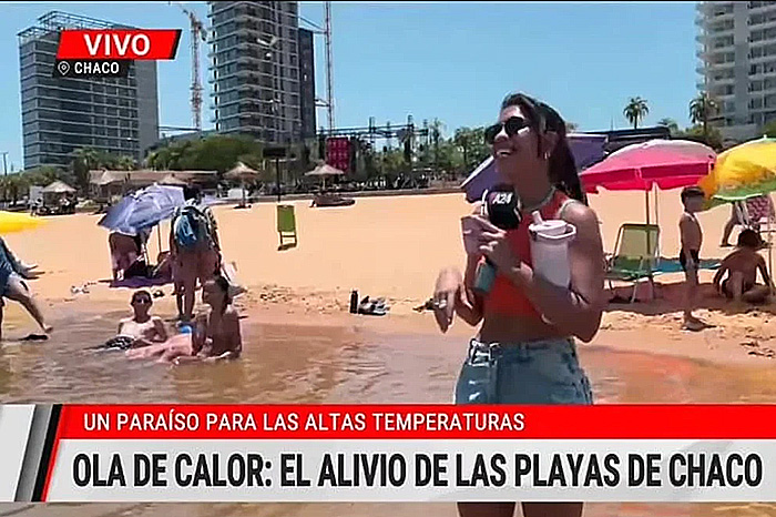 Lo insólito se vio cuando Díaz anunció: “Nos vamos a otra zona de la República Argentina, nos vamos al Chaco”, y en la pantalla apareció la leyenda “Ola de calor: El alivio de las playas de Chaco”.