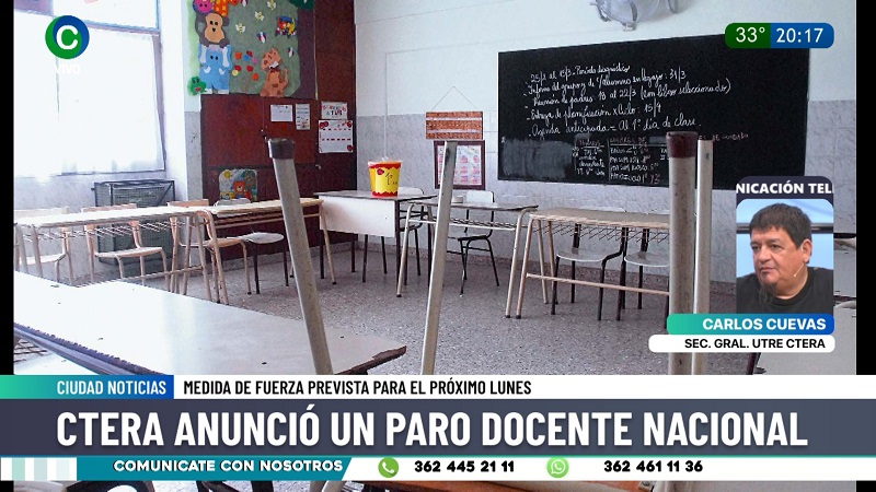 El secretario General de UTRE CTERA Chaco, Calos Cuevas, en diálogo con CIUDAD TV cuestionó la quita del FONID y subsidios nacionales que afectan directamente al “salario, mantenimiento de los edificios, comedor y copa de leche y a los programas socioeducativos, inclusión y de infraestructura”. Rechazó además la convocatoria de Nación por no ser "una convocatoria real a paritarias" y que se da luego del comienzo de las clases para varias provincias.