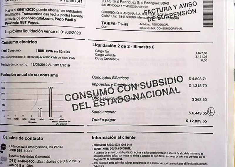 Hasta el consumo de febrero, tenía el 75% de 550 kWh mensuales subsidiados. Pero en el consumo de marzo, sólo se cubrirá con subsidio el 50% de 150 kwh mensuales, y el resto se paga todo tarifa plena, con un salto del costo del kWh en casi 100% según tarifa nacional.
