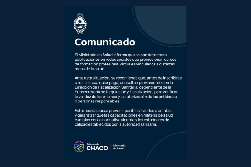 El Ministerio de Salud advierte sobre la circulación de publicaciones en redes sociales que promocionan cursos virtuales de formación profesional sin validación oficial.