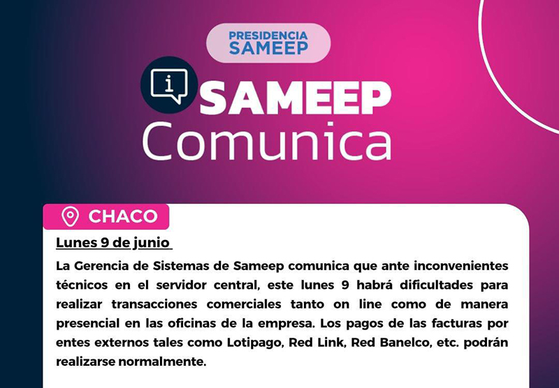 La Gerencia de Sistemas de SAMEEP comunica que ante inconvenientes técnicos en el servidor central, este lunes 9 habrá dificultades para realizar transacciones comerciales tanto on line como de manera presencial en las oficinas de la empresa.