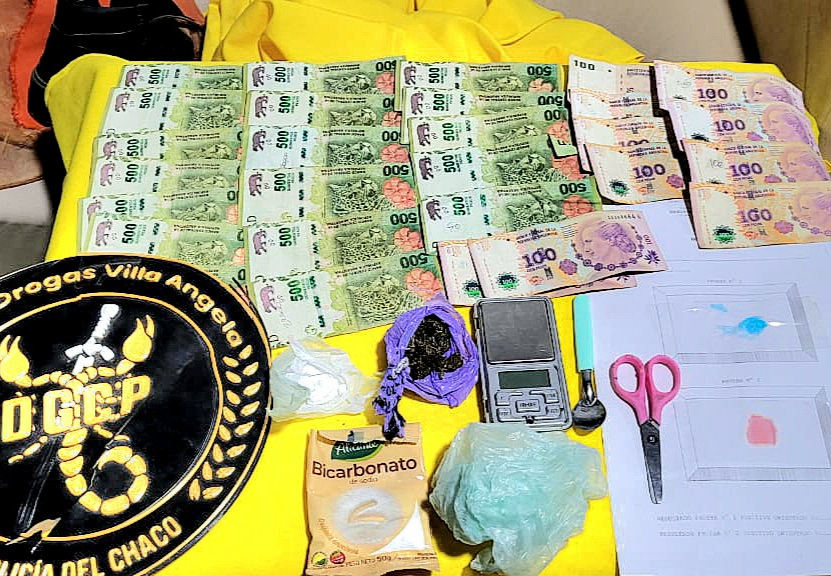 Además, se encontró una balanza digital, tres sobres con bicarbonato, tijera y cuchara con restos de sustancia, retazos de bolsas y 10.000 pesos en efectivo.