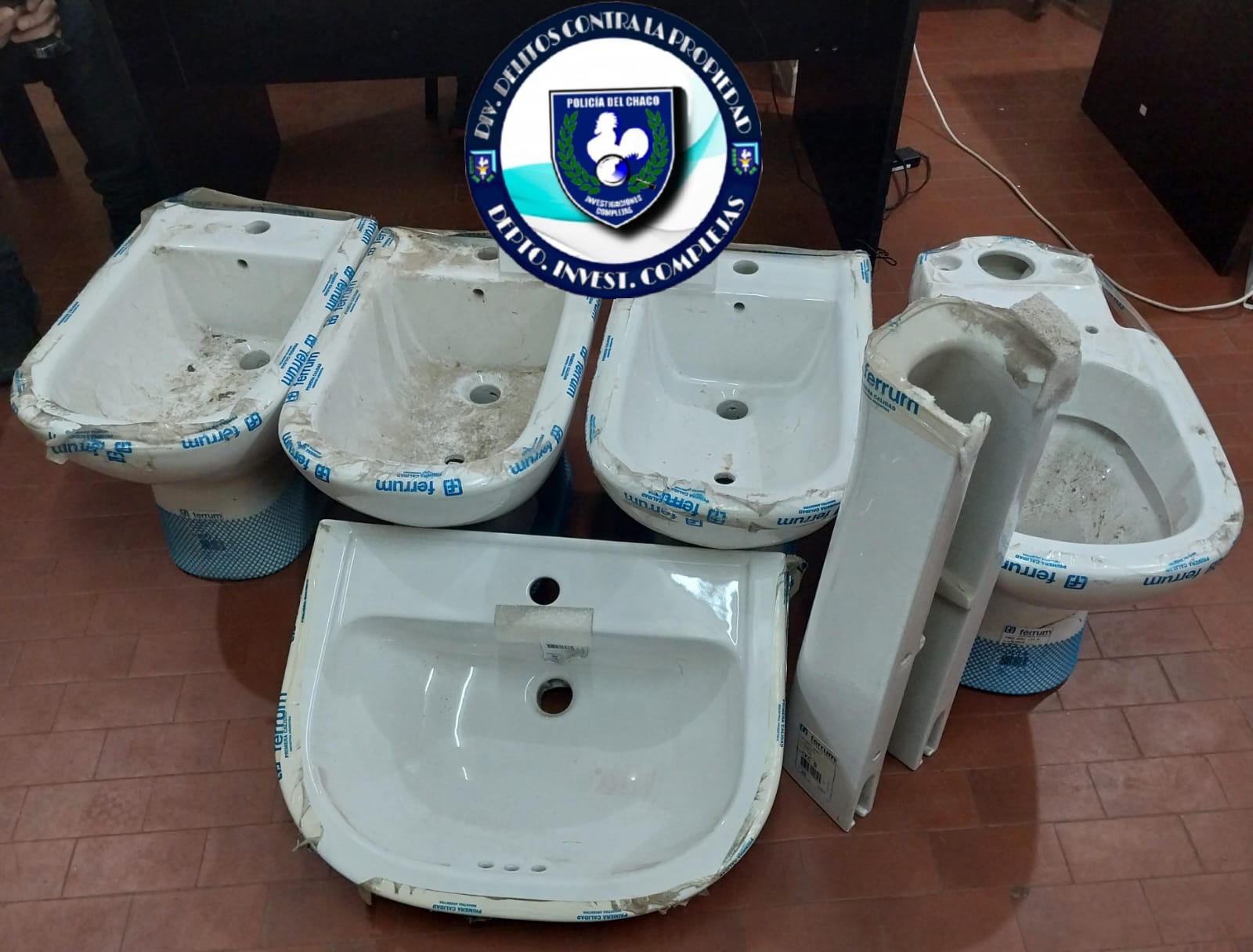 Ante esta situación el personal de la División Delitos Contra la Propiedad se abocó al caso. Tras investigaciones, establecieron que los elementos fueron comercializados por el sereno de la obra. Inmediatamente procedieron a la demora del investigado de 33 años por la avenida Moreno al 3000. Además, recuperaron un inodoro, tres bidets y un lavatorio, marca Ferrum.
