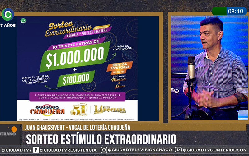 De visita en los estudios de CIUDAD TV, Juan Chaussivert, vocal de Lotería Chaqueña, reseñó detalles del Sorteo Extraordinario de Lotería Chaqueña en el marco del aniversario de su Quiniela Oficial. ''El año pasado cumplimos 60 años de nuestra institución, y la Quiniela - que cumple 51 años de vigencia - es uno de los juegos insignias. Pero también se cumplen 14 años la Quiniela Poceada y con motivo de todo esto existe una bueva oportunidad para devolverle a los apostadores del Chaco su confianza'', sintetizó.