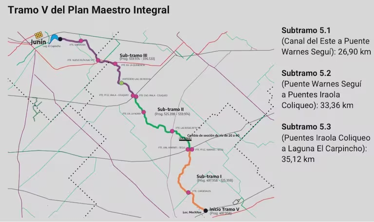 El Tramo V es el último eslabón del Plan Maestro del Salado y abarca 95,38 kilómetros entre el Canal del Este, de la laguna de Bragado, y la descarga en la laguna El Carpincho, en Junín, atravesando además Chacabuco y Alberti.