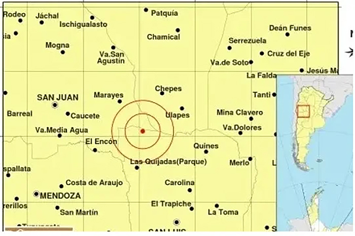 El epicentro se situó en la provincia de San Luis, específicamente en la zona limítrofe con San Juan. Según el informe del INPRES, la ubicación exacta se encuentra a «156 km al E de San Juan; 163 km al N de San Luis; 64 km al SE de Marayes -31.920 (lat) -66.940 (long)».