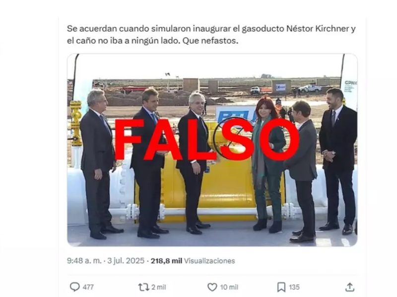 “Se acuerdan cuando simularon inaugurar el gasoducto Néstor Kirchner y el caño no iba a ningún lado. Que nefastos”, dice una publicación en X con una fotografía del expresidente Alberto Fernández y la exvicepresidenta Cristina Fernández de Kirchner, junto a la válvula de una cañería. “Así que no hay gas? Mira vos…. Nunca olviden que Alberto y Cristina montaron un escenario para hacerles creer que inauguraban el gasoducto Néstor Kirchner, y luego lo desarmaron. Memoria”, asegura otro mensaje en Instagram acompañado de un video que muestra a un grupo de obreros junto a un tubo, mientras se escucha “están desarmando lo que ayer Cristina inauguró”.