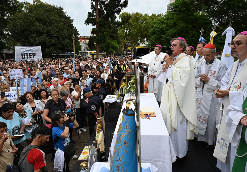 El monseñor Jorge García Cuerva, arzobispo de Buenos Aires, ofreció una homilía en la que recordó este lugar como “la plaza de los excluidos”, donde el sumo pontífice -en sus días como cardenal- “levantaba su voz denunciando tanta injusticia, clamando junto a los más pobres por mejores condiciones de vida”.