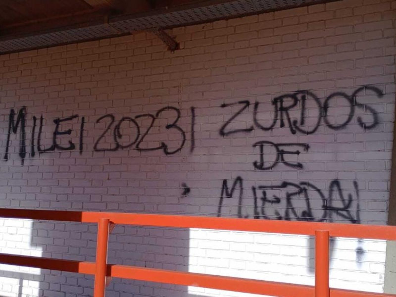 “Chau parásitos, progres y feminazis!”, “Milei 2023! Zurdos de mierda!”, “No enseñan, adoctrinan” y “Antro marxista” fueron otros de los mensajes estampados en el edificio.