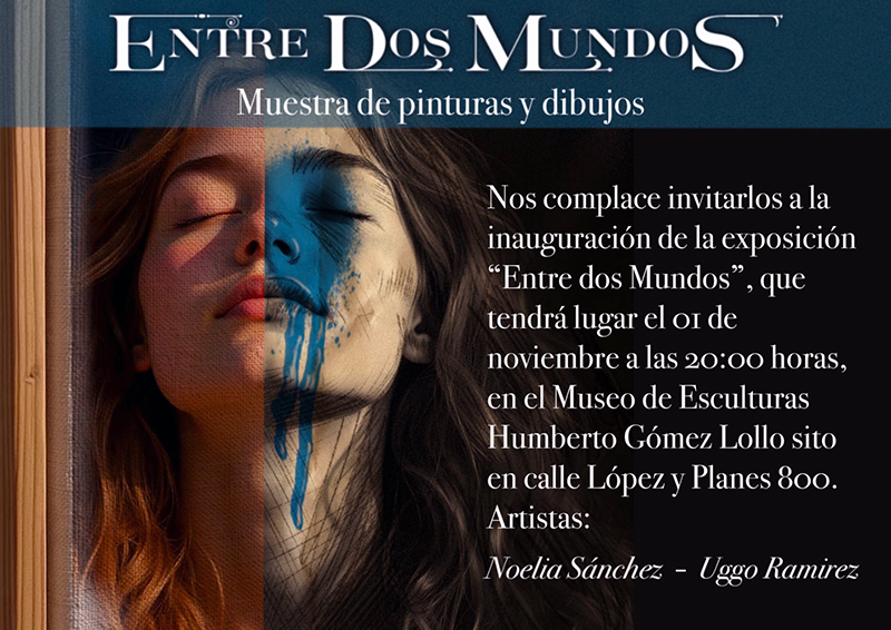 Este sábado 1 de noviembre en el Museo de Esculturas Humberto Gómez Lollo en López y Planes 800, se realizará la exposición de arte pictórico denominada “Entre dos mundos”, donde se exhibirán obras de los artistas plásticos Noelia Sánchez y Uggo Ramírez.