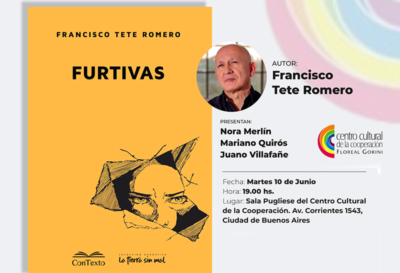 El martes 10 de junio, a las 19:00, en la Sala Pugliese del Centro Cultural de la Cooperación, se presentará la novela “Furtivas”, del escritor y docente chaqueño Francisco Tete Romero de la Editorial Contexto. La presentación estará a cargo de la psicóloga y ensayista Nora Merlín, el narrador Mariano Quirós y el poeta Juano Villafañe.