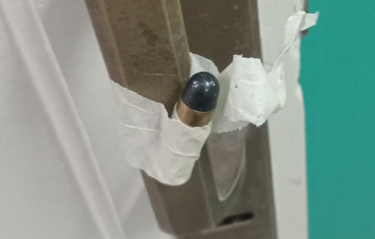 El desagradable y grave suceso fue descubierto por una Doctora, a media mañana de este lunes. Al llegar a su consultorio en una céntrica clínica, halló una munición calibre 38 pegada con cinta al picaporte de la puerta, dando inmediato aviso a la Dirección.