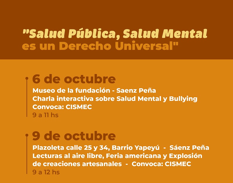 En el marco del Mes de la Salud Mental, las jornadas se repetirán el lunes 9, otra vez en la ciudad termal; el martes 10, en Sáenz Peña, Resistencia y Barranqueras; y el jueves 12 y 19, otra vez en la capital provincial.