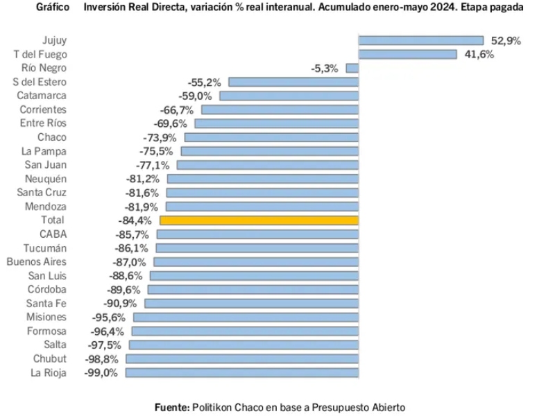 No obstante, Politikon Chaco considera que este año “el agravante es que los descensos fueron muy profundos”. El pico de caída se observa en enero de 2024, con -95,3%, y, salvo febrero (-74,1%), en el resto de los meses del año, el retroceso fue superior al 80% real interanual.