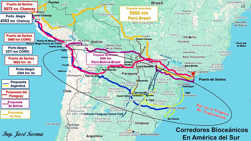 Sin embargo, este no es el único corredor proyectado en América del Sur sobre el eje del Trópico de Capricornio, ya que existen dos iniciativas principales: la del Paraguay y la propuesta por la Argentina.