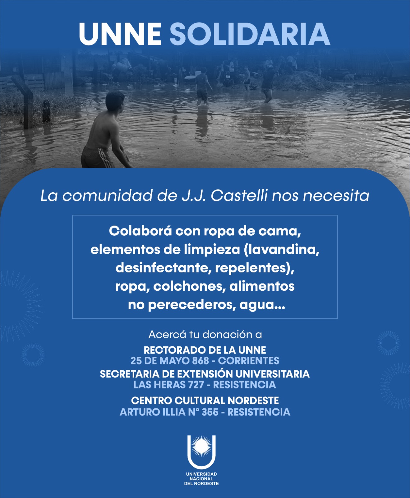 Ante la situación de emergencia climática que vive por estas horas la región del Impenetrable chaqueño, en particular, las localidades de Juan José Castelli, Villa Río Bermejito, Misión Nueva Pompeya, El Espinillo, Miraflores y Fortín Lavalle,  la Universidad Nacional del Nordeste ha lanzado una campaña para obtener donaciones destinadas a las familias afectadas por las inundaciones que han provocado las intensas lluvias caídas en los últimos días en aquella zona.