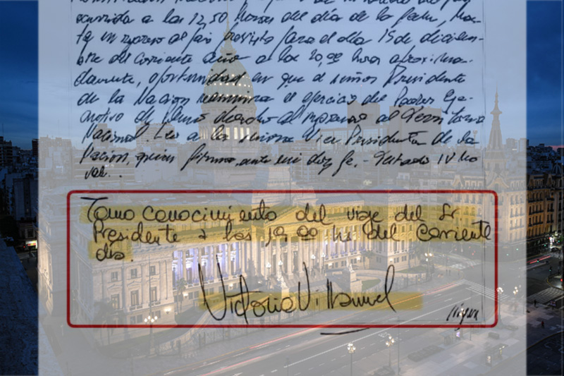 A casi dos semanas de los hechos, Ferraro informó a través de X que se dio por “terminado el culebrón libertario”, y adjuntó la copia que le envío el escribano general de Gobierno con el acta del día 12 de diciembre: Allí se observa que la vicepresidenta “toma conocimiento del viaje del presidente a las 19”.