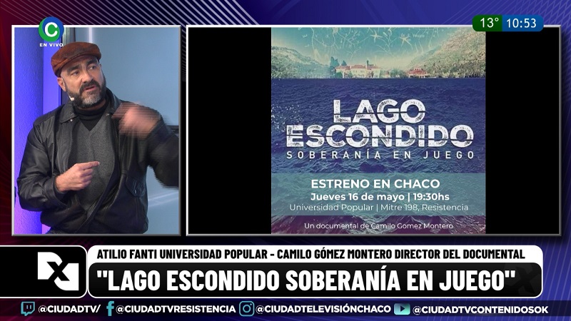 El director del documental ‘Lago Escondido, soberanía en juego’, Camilo Gómez Montero, de vista en los estudios de CIUDAD TV, junto al titular de la Universidad Popular, Atilio Fanti, invitaron a la proyección de la película este jueves en la institución ubicada en Mitre 198, a las 19.30.