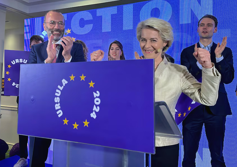 La candidata del Partido Popular Europeo, la alemana Ursula von der Leyen, celebra junto al presidente de Partido Popular Europeo, Manfred Weber, los resultados de las elecciones europeas.