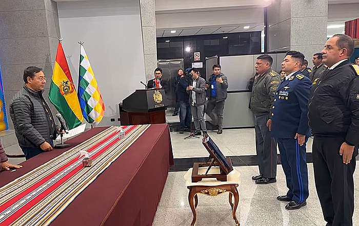 El mandatario boliviano tomó el juramento de los generales José Sánchez Velásquez como comandante del Ejército; Gerardo Zabala Álvarez, de la Fuerza Aérea, y Renán Guardia Ramírez, de la Armada.
