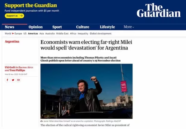 El diario británico The Guardian difundió una carta firmada por más de un centenar de economistas, quienes alertaron sobre el efecto "devastador" para la Argentina, en caso de acceder al poder el candidato libertario.