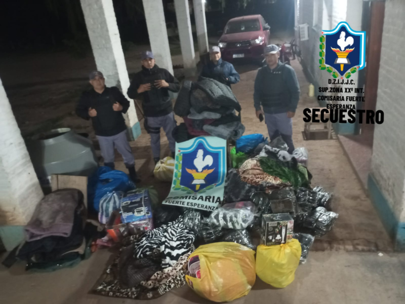 En un trabajo conjunto la Comisaria de Fuerte Esperanza y Taco Pozo, en controles fronterizos con otras provincias, este viernes por la madrugada demoraron a una camioneta en un camino rural en la zona del Parque Provincial Loro Hablador. El vehículo transportaba cubiertas, hojas de coca, frazadas, camperas, ojotas, gomones y otras prendas de vestir que no contaban con el aval aduanero.