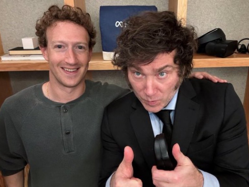 “FENÓMENO BARRIAL CON MARK ZUCKERBERG. VIVA LA LIBERTAD CARAJO”, escribió Milei en su cuenta de X, mensaje acompañado por una foto posando con los pulgares hacia arriba y escoltado por el mega empresario tecnológico, quien lució una sonrisa.