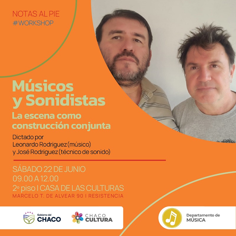 Este sábado 22 de junio, de 9 a 12, en la Casa de las Culturas (Marcelo T. de Alvear 90) del Instituto de Cultura del Chaco, se vivirá una nueva edición del ciclo de capacitaciones Notas al Pie que organiza el Departamento de Música del organismo. Esta edición se orientará a “Músicos y Sonidistas – La escena como construcción conjunta”. La participación es libre y gratuita.