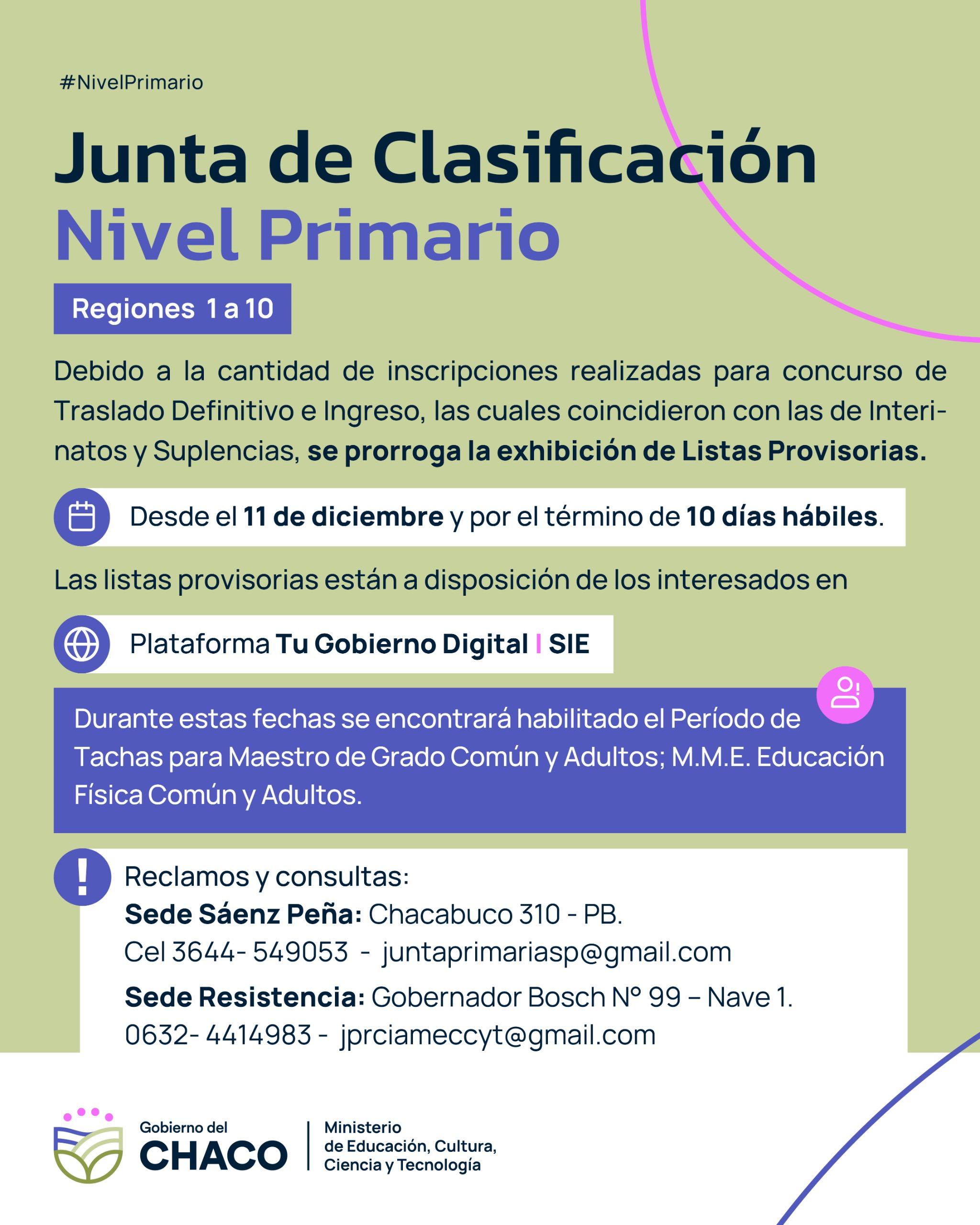 El Ministerio de Educación, a través de las Juntas de Clasificación de Nivel Primario de Presidencia Roque Sáenz Peña y Resistencia (Regiones 1 a 10), informa a los docentes de la provincia que, debido al volumen de inscripciones registradas en los concursos de Traslado Definitivo e Ingreso —coincidentes con las de Interinatos y Suplencias—, se prorroga la exhibición de las Listas Provisorias.